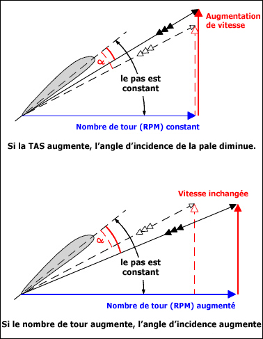 Si la vitesse de rotation augmente pour une vitesse de l'avion inchangée, l'angle d'incidence entre la pale d'une hélice à calage fixe et le vent relatif augmentera.